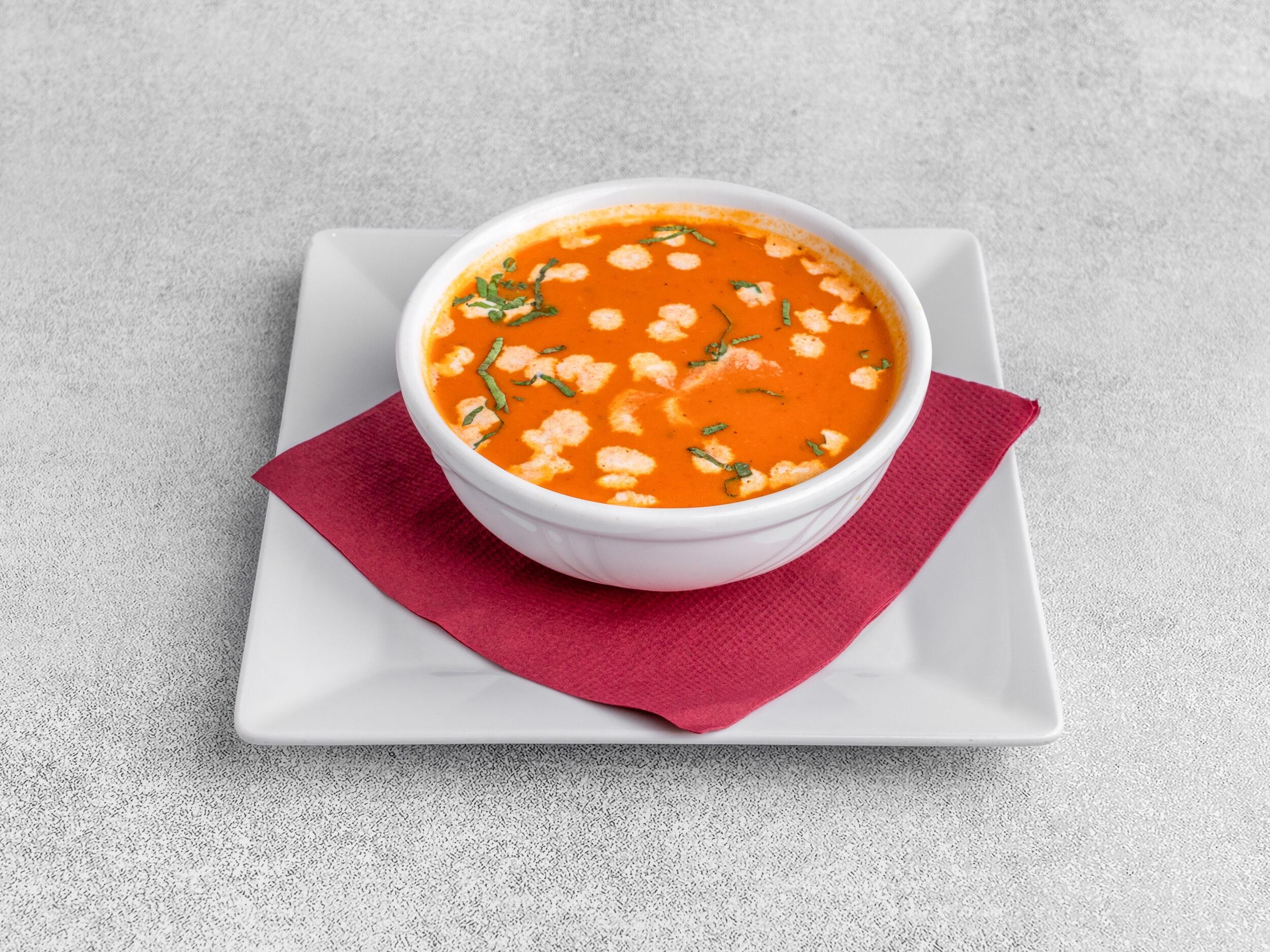 Kremowa zupa delikatnie przyrządzona z pomidorami, liśćmi kolendry i indyjskimi przyprawami